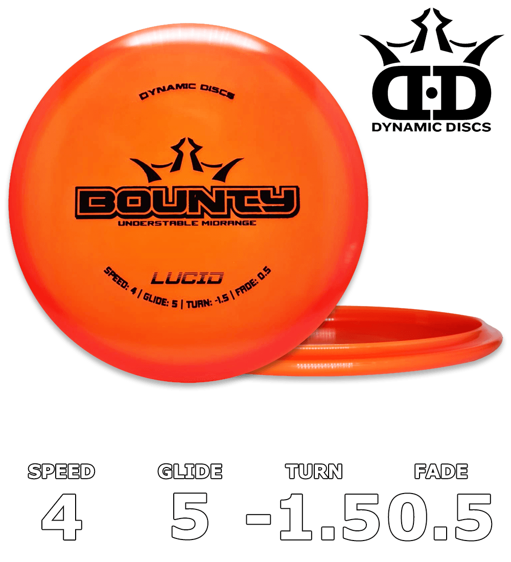 The Bounty brings a different feel to the Dynamic Discs midrange lineup. With a shallow rim and bead, the Bounty is a slightly understable midrange that acts like a slower Maverick. At shorter distances and slower speeds, the Bounty will fly very straight with good glide and minimal fade. When thrown with more speed, the Bounty will slowly move to the right without burning into the ground. Use the Bounty to shape shots in the open or in the woods, and you'll love the control you gain!