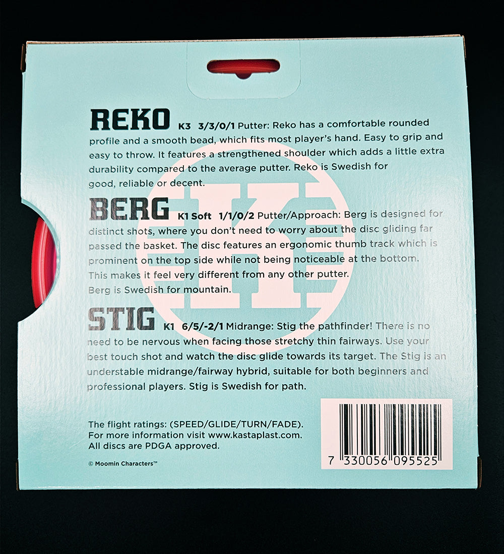 The Moomin characters are represented in this 3-disc set. The K3 Reko, The K1 soft Berg and the K1 Stig is a perfect introduction to the sport of disc golf and to Moomin collectors of all sorts. Make yourself happy or make someone else’s day with this gift friendly box.
