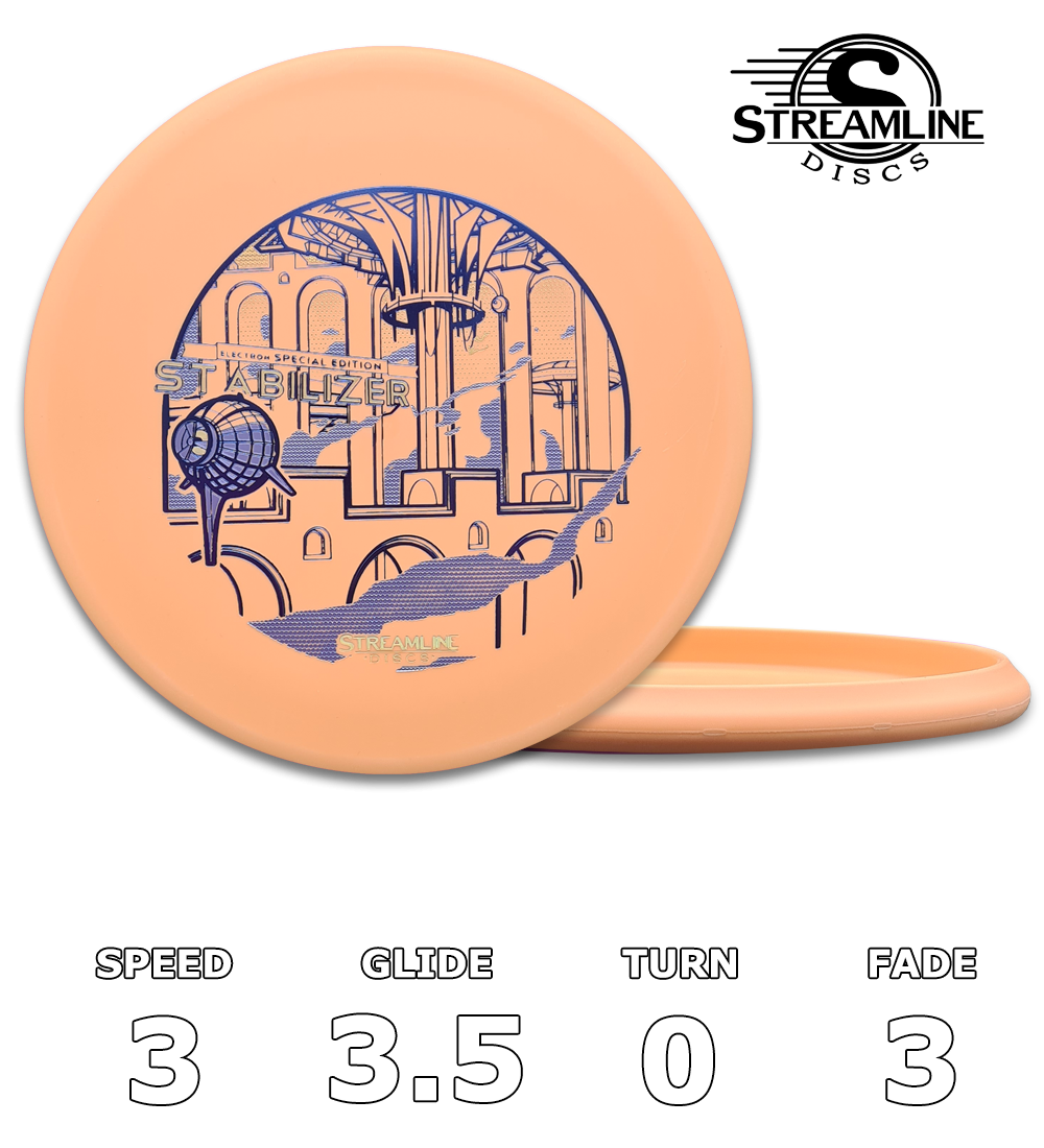 The Stabilizer is an overstable putter from Streamline Discs, debuting in Streamline Neutron and Cosmic Neutron plastic. This is the second putter from Streamline Discs and complements the Streamline Pilot as an overstable option. The Stabilizer has a similar feel and depth in the hand as the Neutron Pilot, but with a slightly raised shoulder and a more pointed nose, resulting in a flatter and more stable flight. The Stabilizer's defining flight characteristic is straight paths with minimal turn, fading strongly at the end for point-and-shoot accuracy on approach shots.