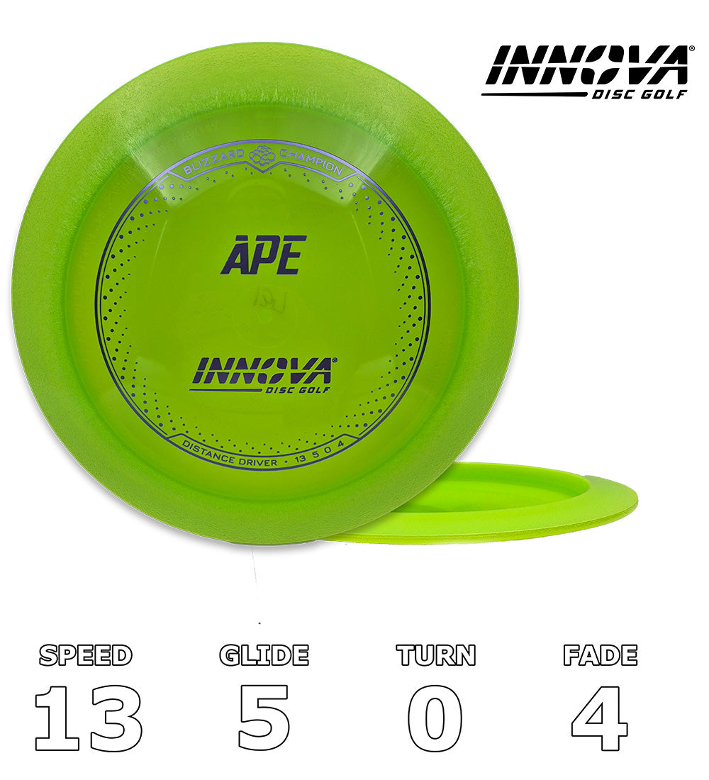 The Ape can handle the raw, primal power of disc golfs biggest arms. Extremely fast and stable, the Ape is a "must have" distance driver for windy conditions and sharp doglegs. Sidearm drivers will learn the Ape is more than capable of standing up to even the most intense torque. The Ape is an outstanding choice for backhand or sidearm throws as well as a variety of niche flex shots. With less high speed turn than a Boss, the Ape is not recommended for players who throw less than 300ft.